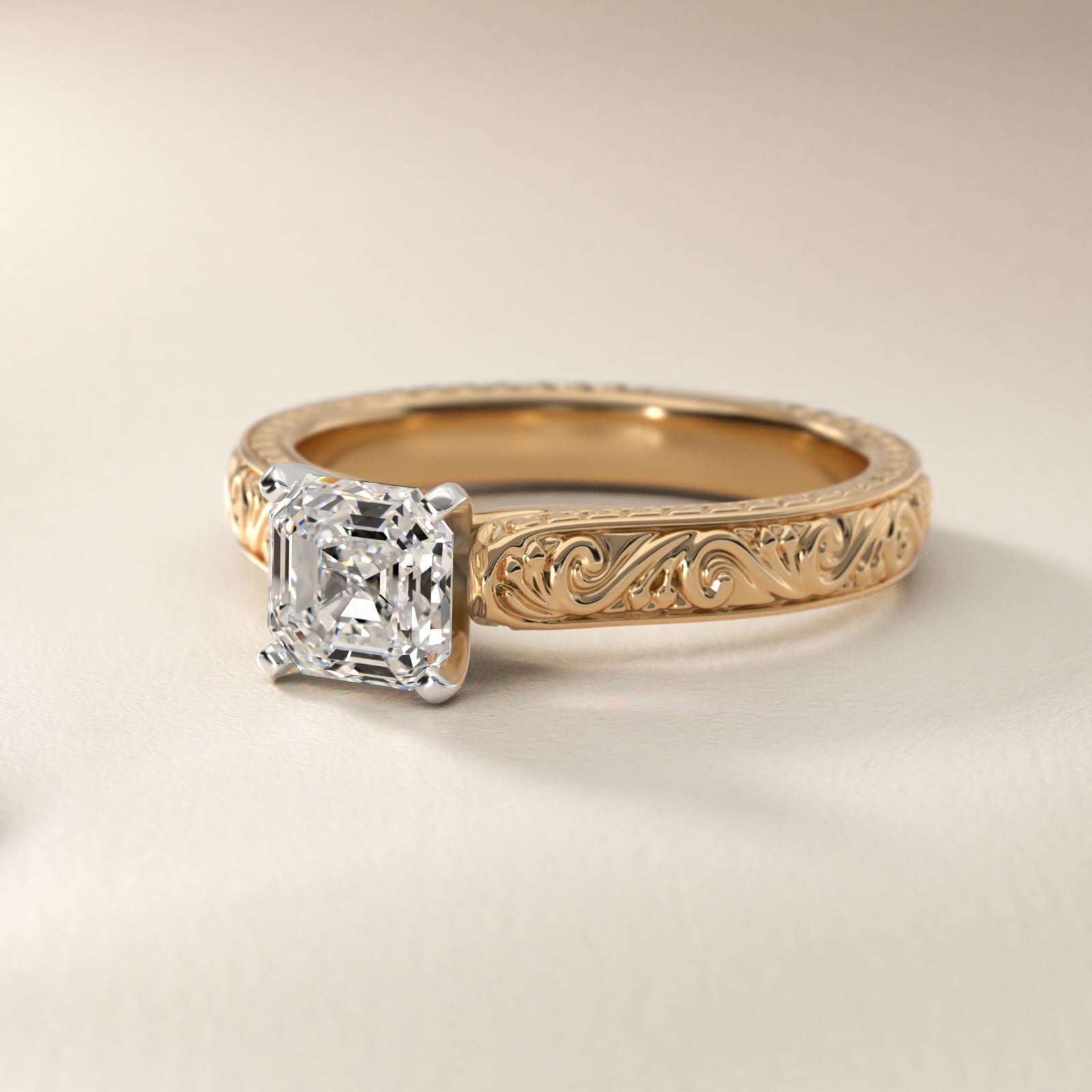 Asscher Cut Diamond Solitaire Ring in Yellow Gold with Hand Engraved Vintage Band