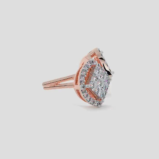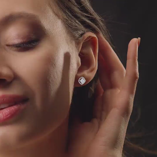 These silver cushion halo diamond stud earrings are designed to express refined elegance through a perfectly balanced geometric silhouette that feels both classic and contemporary. The softly squared cushion shape is crafted in polished silver and framed with a delicate halo of shimmering diamonds, creating depth and dimension while drawing attention to the brilliant central diamond cluster. Light reflects beautifully across the layered surfaces, enhancing the sparkle and giving the earrings a radiant and sophisticated presence on the ear.