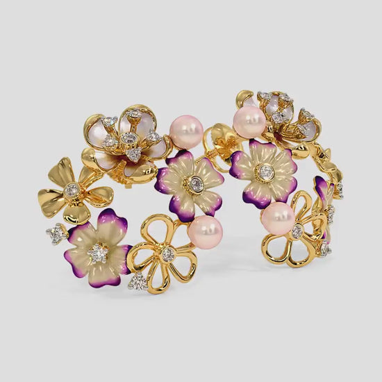 This silver floral pearl diamond hoop earrings design showcases an artistic circle of blooming motifs where sculpted silver flowers, luminous pearl accents, and shimmering diamonds come together in a graceful harmonious form. The intricate silver craftsmanship creates a flowing wreath like silhouette, while the polished silver surfaces reflect light softly, enhancing the natural elegance of the floral composition. Each element feels thoughtfully placed, giving the earrings a refined presence that feels delicate yet visually rich.